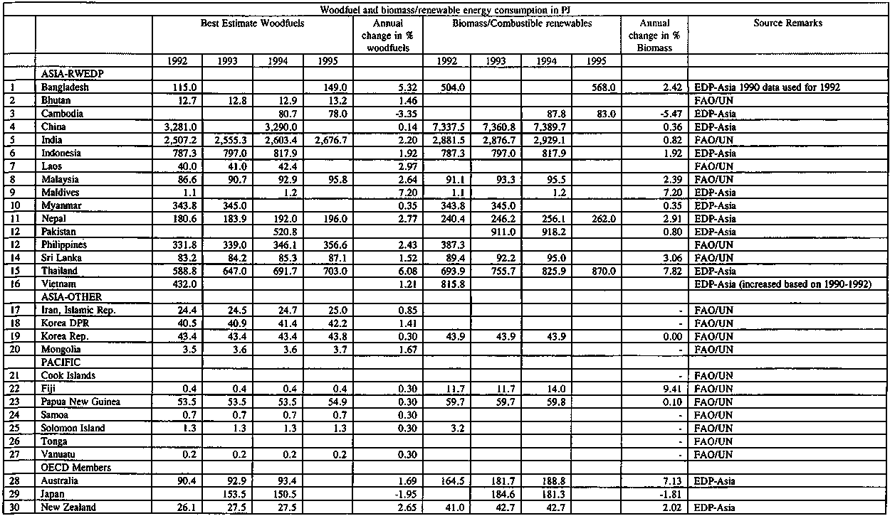 Table 7.1 - Best estimate with regard to woodfuel and biomass energy use in the Asia-Pacific region