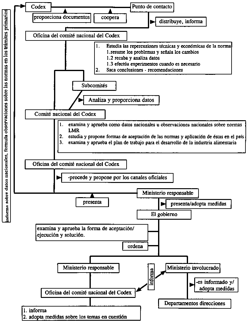 Para la aceptación de las normas del Codex, la propuesta o consideración se remitirá al gobierno a efectos de que la apruebe y asigne al organismo competente la responsabilidad de adoptar las medidas que correspondan. Para hacer respetar las normas y LMR del Codex se aplicarán las leyes en vigor relacionadas con el tema de que se trate.