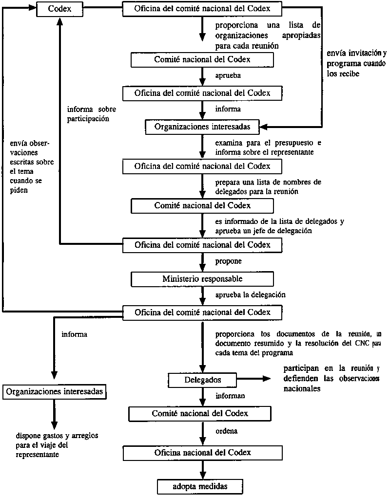 Las delegaciones que asisten a las reuniones del Codex siempre han estado integradas por representantes de distintos ministerios y asociaciones interesadas; según propuestas formuladas por el CNC y aprobadas por el ministerio responsable.