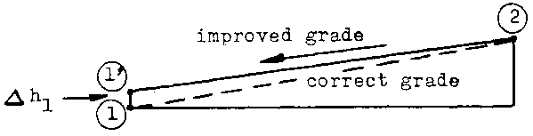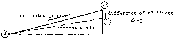 c) For long cuts across ridges which obstruct the sight, the clinometer is used as a levelling instrument to transfer the elevation of the last point around the ridge using 0 percent sights. The distance between the terminal points of the cut is determined by means of the tape and the centre line is marked. By means of the gradient and the distance the difference in elevations can be calculated easily using the formula: