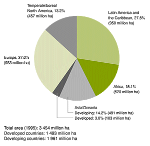 The area of the world's forests, including natural forests and forest plantations, was estimated to be 3 454 million hectares in 1995, or about one-fourth of the land area of the Earth. About 55 percent of the world's forests are located in developing countries, with the remaining 45 percent in developed countries (Figure 1) (see Table 2 of Annex 3 for country data). The world's forests are almost equally divided between tropical/subtropical forests and temperate/boreal forests. Only about 3 percent of the world's forests are forest plantations. The remaining 97 percent are natural or semi-natural forests.