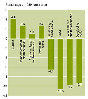 Data published in the State of the World's Forests 1997 (FAO, 1997d) provide a picture of the trends in forest cover over a 15-year interval (1980-1995) and allow a comparison between the 1980-1990 and 1990-1995 periods. Between 1980 and 1995, the extent of the world's forests (including both natural forests and forest plantations) decreased by some 180 million hectares. There was a net increase of 20 million hectares in developed countries, but a net loss of 200 million hectares in developing nations. The change in forest area by region between 1980 and 1995 is shown in Figure 2.