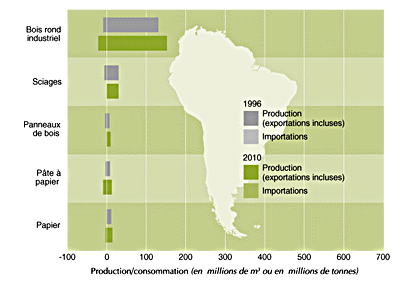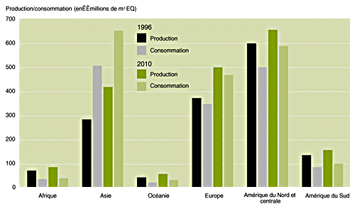 Les tendances globales de production et de consommation diffèrent de façon évidente entre les pays développés et les pays en développement. Les premiers comptent pour 70 pour cent dans la production et la consommation mondiales de produits industriels du bois. Les pays en développement, en revanche, produisent et consomment environ 90 pour cent du bois de feu et du charbon de bois, combustibles qui constituent la principale source d'énergie des ménages dans bon nombre des pays concernés (voir figure 3). On consomme chaque année dans le monde plus de bois de feu et de charbon de bois que de bois rond industriel, et la demande de bois de feu devrait continuer de croître à un rythme d'environ 1,1 pour cent par an jusqu'à l'an 2010, alors que l'on prévoit, pour la demande de bois rond industriel, une hausse d'environ 1,7 pour cent par an pendant la même période. Plusieurs facteurs sont de nature à influencer la manière dont il sera répondu à ces demandes croissantes: l'expansion des sources de bois, provenant notamment des plantations et des arbres situés hors forêt, l'amélioration des procédés de traitement du bois et de leur rentabilité, et le recours accru aux fibres recyclées et non ligneuses. Enfin, les échanges commerciaux poursuivront leur rôle régulateur entre les déficits et les excédents des différentes régions du monde.