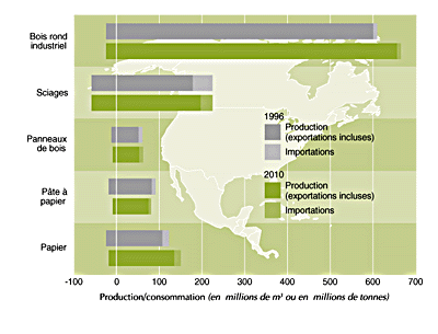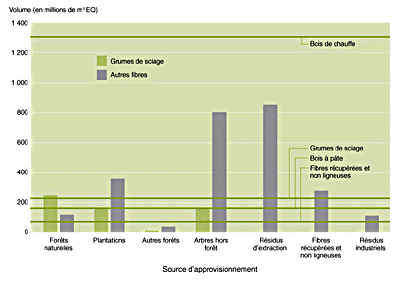 Offre de bois. Les sources de bois et d'autres fibres utilisées pour la production évolueront probablement à l'avenir. On prévoit que, dans la plupart des pays, la production de bois et de fibres délaissera de plus en plus les ressources forestières au profit d'autres sources végétales et d'autres d'approvisionnements. L'utilisation croissante des résidus de transformation du bois et des fibres recyclées dans l'assortiment des intrants utilisés constituera le changement le plus significatif. Ces sources secondaires prendront de plus en plus d'importance dans les régions plus développées d'Amérique du Nord, d'Europe et d'Asie, tandis que les arbres hors forêt devraient jouer un rôle plus significatif, à mesure que les ressources forestières diminueront dans certaines régions moins développées.
