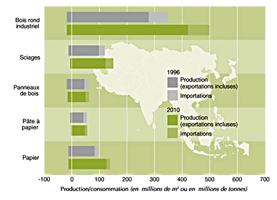 Dans des régions comme l'Afrique et l'Asie, où les approvisionnements provenant des forêts (en particulier les grumes de grande taille) sont sous pression, les consommateurs de bois et de fibres devront de plus en plus se tourner vers d'autres sources pour répondre à la demande (comme ils le font déjà en Asie) s'ils ne veulent pas surexploiter les forêts. Ou, plus vraisemblablement, on assistera au renforcement de la tendance des marchés des produits forestiers à remplacer les bois de sciage et les contre-plaqués par d'autres panneaux à base de bois et par des produits de haute technologie, qui peuvent être fabriqués avec du bois de petites dimensions ou avec des substituts non ligneux.
