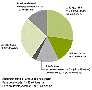 La superficie du couvert forestier, comprenant les forêts naturelles et les plantations, a été estimée à 3 454 millions d'hectares en 1995, soit environ un quart des terres émergées de la planète. Près de 55 pour cent des forêts du monde se situent dans les pays en développement, 45 pour cent dans les pays développés (voir figure 1) (voir tableau 2 de l'annexe 3 pour les données par pays). Les forêts du monde se partagent de façon à peu près égale entre forêts tropicales/subtropicales et forêts tempérées/boréales. Seulement 3 pour cent environ des forêts du monde sont des plantations forestières. Les 97 pour cent restants sont des forêts naturelles ou semi-naturelles.