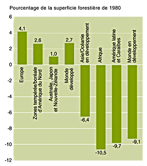 Les données publiées dans la Situation des forêts du monde 1997 (FAO, 1997d) donnent une idée des tendances du couvert forestier sur une période de 15 ans (1980-1995) et permettent d'établir une comparaison entre les périodes 1980-1990 et 1990-1995. De 1980 à 1995, la superficie des forêts du monde (comprenant à la fois les forêts naturelles et les plantations) a diminué de quelque 180 millions d'hectares. Il y a eu un accroissement net de 20 millions d'hectares dans les pays développés mais une perte nette de 200 millions dans les pays en développement. La variation du couvert forestier par région entre 1980 et 1995 apparaît à la figure 2.