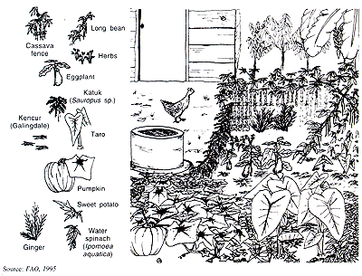 Whether they are known as home, mixed, backyard, kitchen, farmyard, compound or homestead gardens, family food production systems are found in most regions of most countries worldwide. They may be the oldest production system known and their very persistence is proof of their intrinsic economic and nutritional merit. Traditional tropical gardens typically exhibit a wide diversity of perennial and semi-perennial crops, trees and shrubs, well adapted to local microclimates and maintained with a minimum of purchased inputs (Figure 1). Studies on traditional mixed gardens have emphasized their ecologically sound and regenerative characteristics, by which they "recreate natural forest conditions" and minimize the need for crop management (UNICEF, 1982).