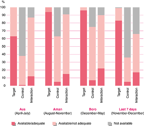 Women in target households were more than twice as likely as control households to make the decisions about distribution of garden produce for home consumption or sale (making 65 and 25 percent of the decisions, respectively). Also, women in the target group were more than twice as likely as those in the control group to receive income and to exercise control over funds earned from garden sales (67 compared with 31 percent).