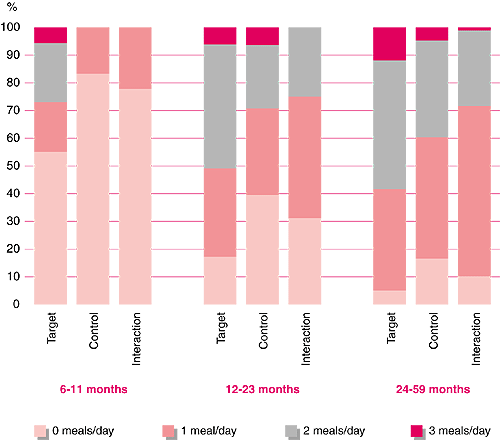 Average weekly per caput vegetable consumption for target households increased from 5.8 to 7.5 kg (compared with a slight increase from 5.1 to 5.4 kg for the control group). This equals nearly 200 g per person per day, the FAO recommended minimum intake of vegetables. Intrahousehold consumption data indicate a highly positive impact on vegetable consumption by infants and very young children (Figure 3). Medical evaluation showed that night blindness in children, a symptom of vitamin A deficiency, declined from 2.3 to 1.2 percent in the target group, although prevalence beyond 1 percent is still considered of public health significance.