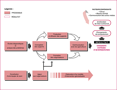 Cette innovation a pu suivre une démarche logique d'intervention dans la communication sociale, respectant les étapes d'analyse des problèmes, de formulation d'objectifs et de messages précis, de conception et de prétest des supports et de formation des agents, avant de se lancer dans la communication avec les populations. Pour être formative, l'évaluation d'une telle innovation peut emprunter des méthodes globales et participatives, telles que l'analyse causale qui permet d'avoir une vue d'ensemble des problèmes et de leurs déterminants, et la construction d'un modèle dynamique de l'intervention, qui permet de situer très précisément les processus par rapport à leurs intrants, résultats et effets.