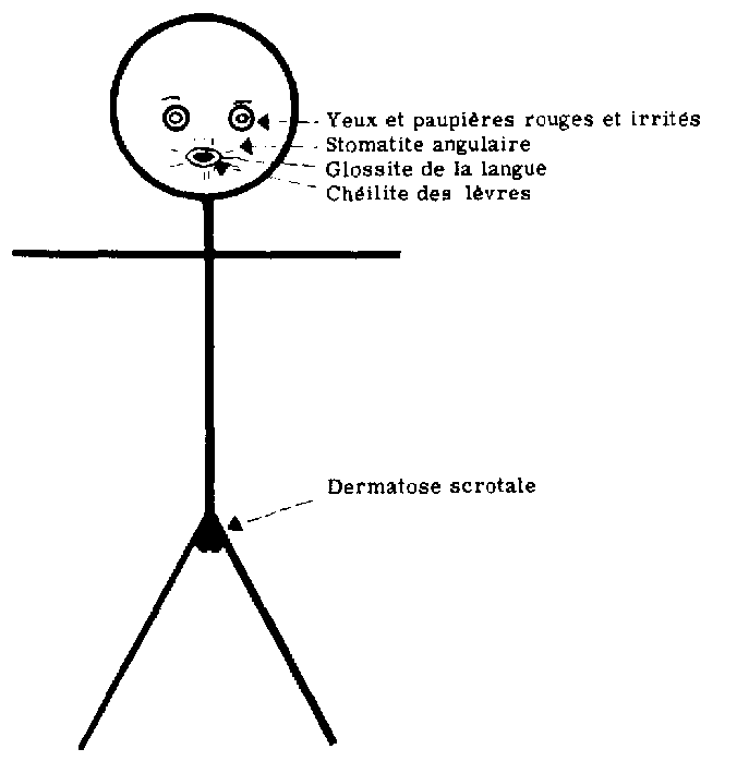 La peau du scrotum chez l'homme (ou des grandes lèvres chez la femme) présente des altérations; elle parait sèche, irritée. Il peut y avoir desquamation, vives démangeaisons et infection secondaire. Une carence en riboflavine (et peut-être en d'autres vitamines B) semble en être la cause.