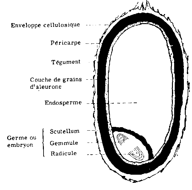 La figure 41 montre la structure d'un grain de blé. Cette structure est la même pour toutes les graines de céréales. Elle consiste en: