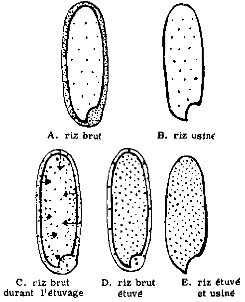 Le paddy, ou riz non décortiqué (mpunga), est généralement passé à la vapeur. L'eau est absorbée par le grain entier, y compris l'endosperme, et les vitamines B qui sont hydrosolubles se trouvent ainsi également réparties (figure 44). Le paddy est ensuite séché, débarrassé de ses enveloppes cellulosiques, et peut alors être usiné de la façon ordinaire. Même s'il est fortement usiné et poli, il contient encore la majeure partie de la thiamine et des autres vitamines B.