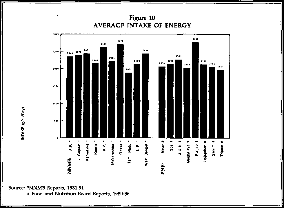 a) While energy and protein intake at the national level may appear quite satisfactory, which is also indicated by the availability of foodstuffs as worked out by the Working Group of the Ministry of Agriculture (April, 1994), the situation varies greatly between states. Although there is a mix-match between consumption of energy and proportion of people below poverty line, exemplified forcefully by Orissa, the difference in consumption would really be due to prevalence of poverty, status of health and educational attainments.