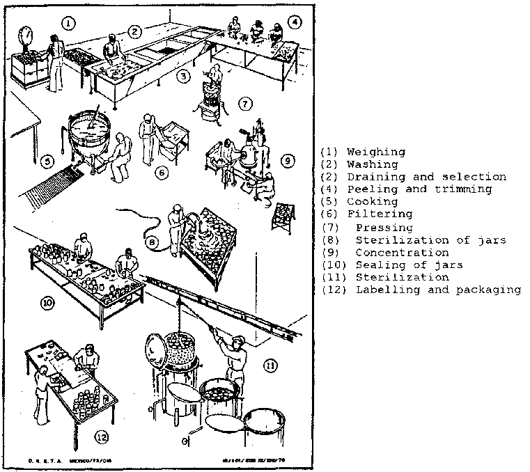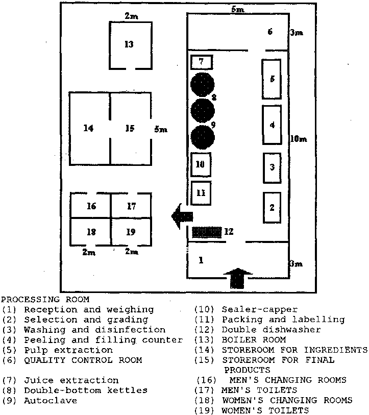 A fruit and vegetable processing plant must be set up in such a way as to rely on a number of basic facilities, which are generally similar in home-processing and small-scale industrial systems. Figure 1 shows a small-scale industrial production system for the processing of fruits and vegetables.