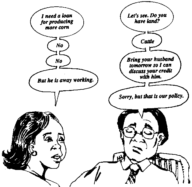 - Most women cannot get financial credit on their own because they do not own land, cattle or other types of collateral. Often, their husband's approval is needed to obtain credit or a loan.