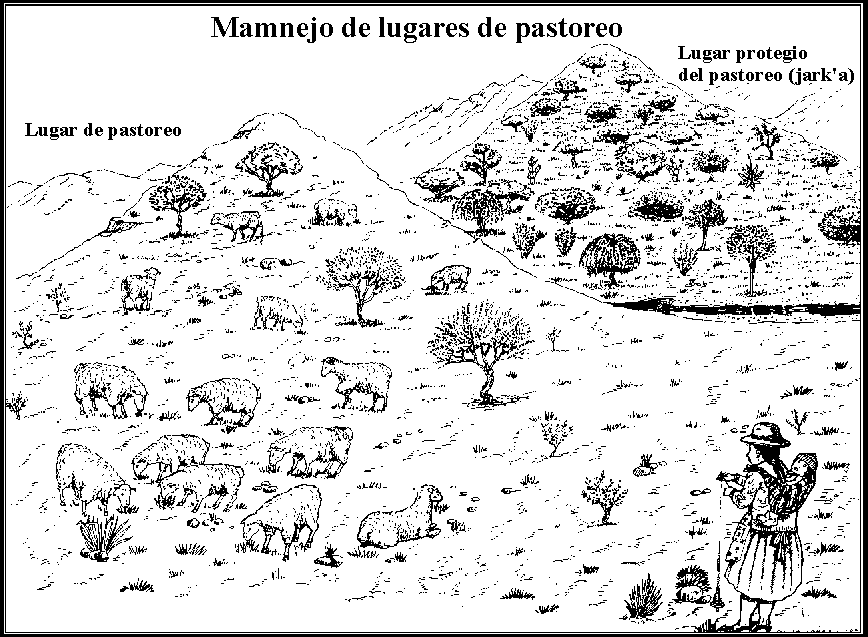 En épocas de estiaje, los ganados mayores, por lo general, son trasladados a los valles, bajo responsabilidad de los hombres; toda la familia sabe que estos ganados no podrían soportar la temporada de sequía. Las mujeres se quedan en la comunidad al cuidado del ganado menor; pastean sus animales en los diferentes lugares destinados al pastoreo y proveen forraje con rastrojos o chhallas de maíz, cebada y otros que van administrando. Son, pues, espacios definidos por la división del trabajo entre hambres y mujeres.