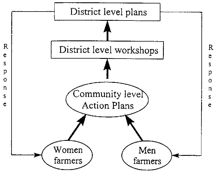 This diagram illustrates how the Nepal project attempted to facilitate a process of participatory, gender responsive planning at the district level. The project "entered" by training a wide range of district officers and field staff in PRA and gender analysis. PRAs were conducted with separate groups of men and women farmers, both to provide gender-specific information for district planning and to develop Community Action Plans as potential inputs for district planning. By using separate men's and women's focus groups, the project attempted to assure that women's needs and priorities would be represented equally with men's. However, when men and women farmers were brought together to produce a single Community Action Plan (CAP), in most cases women's priorities were overshadowed by men's. As noted in the diagram, the project had planned to organise district workshops where farmers would discuss their CAPs with district planners. This would have provided a direct link to district planning and, if implemented, would have been a "best practice". Nepal was one of the few projects that attempted to forge as direct a link with planning processes. (As mentioned earlier, however, the district workshops were cancelled.)
