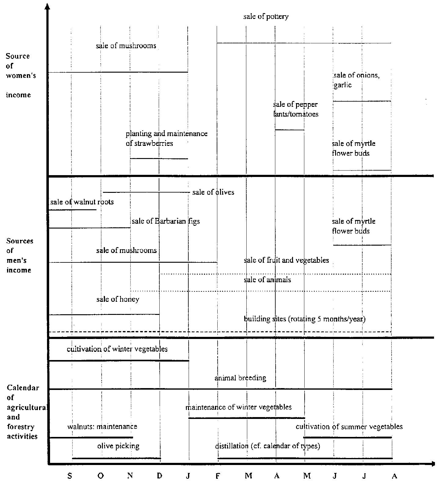 The Tunisian PRAs reaffirmed women's important roles in agriculture and natural resource management. The seasonal calendars showed that women tend to diversify the sources of their income just as men do. Men's and women's priorities for women's income generating activities differed somewhat, with men favouring activities that would keep women closer to home, while women gave their highest priority to livestock rearing (including large livestock), which currently takes up much of their time and for which they have mastered the skills. It would be interesting to know how the planners reacted to the differences in men's and women's priorities for women's economic activities.