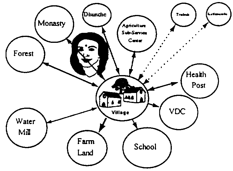 In Nepal the PRAs revealed that women play crucial roles in household decision-making over the use of land. This information was critical to planning for extension, natural resource management, crops, livestock and forestry departments. The men's and women's mobility maps developed during the PRAs (reproduced on the next page) showed that women did not travel to the Agricultural Sub-Service Centre located outside the village (where agricultural training normally took place), and did not attend the Village Development Committee meetings, go to school or even travel to the health clinic. Discussions of these maps revealed the reasons that women had rarely, if ever, had the opportunity to participate in extension training courses. Women's priority rankings, however, showed that extension and other forms of skills training was their highest priority. This, of course, was vital information for extension programme planners. It convinced them that extension training for women must be carried out in the village itself.