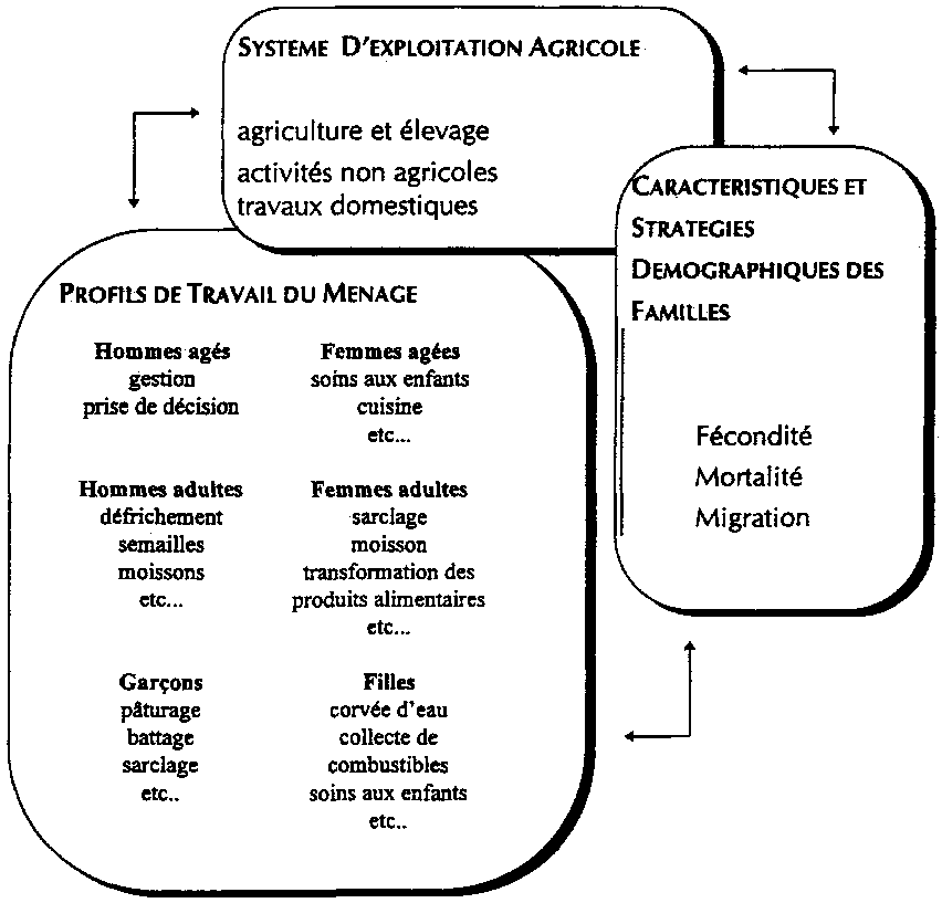 Le cadre conceptuel présenté ci-dessous expose dans leurs grandes lignes quelques unes des relations entre répartition du travail par sexe et âge, systèmes d'exploitation agricole et caractéristiques et stratégies démographiques des ménages. Ce modèle suppose que les familles cherchent à optimiser cet ensemble de variables et que les interactions entre ces dernières se produisent suivant un schéma rationnel. Les systèmes d'exploitation agricole tendent à évoluer plus rapidement que la division du travail et que les caractéristiques et stratégies démographiques des ménages. Ses transformations sont donc susceptibles de provoquer des dysfonctionnements, éventuellement systémiques, dans les deux autres domaines.