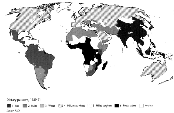 THE WORLD'S major diets have been classified for 119 countries on the map above.