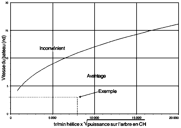 Dans cette figure, la vitesse du bateau est considérée comme l'élément essentiel de son exploitation (dans le cas d'un chalutier, la vitesse de chalutage et non la vitesse en route libre). La vitesse de rotation de l'hélice est calculée à partir de la vitesse à pleine puissance du moteur divisée par le rapport du réducteur: