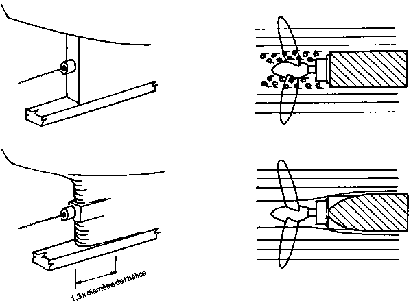 Espaces libres et cage d'hélice. Les distances entre l'hélice et la coque déterminent l'efficacité de l'hélice dans l'eau qui s'écoule le long de la coque et l'intensité des vibrations produites par l'hélice. Le tableau 3 indique les dégagements recommandés.
