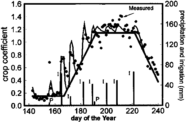 Measured (symbols) and predicted (thin line) daily coefficients (Kcb + Ke) and the basal crop curve (thick line) for a dry bean crop at Kimberly, Idaho. P in the figure denotes a precipitation event and I denotes an irrigation (data from Wright, 1990). |