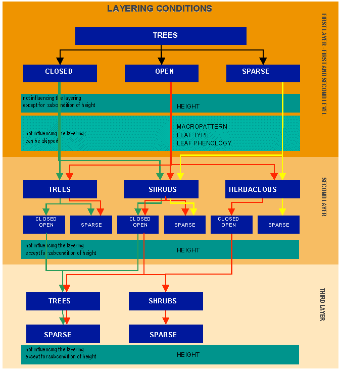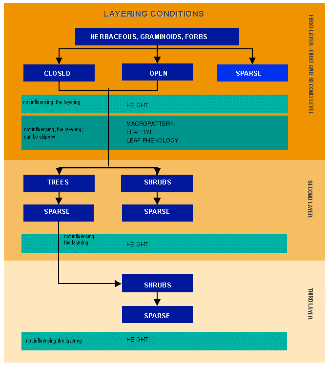 What is normally called "Tree Savannah" consists of a closed herbaceous vegetative cover that forms the main layer, with a second layer of sparse trees projecting above. In this case, the use of the uppermost canopy concept would designate the trees as a dominant layer over the herbaceous layer. Because of the sub-condition of cover, sparse trees cannot be the dominant Life Form with the presence of the closed herbaceous layer. This concept must be carefully considered due to the in-built conditions in the classification system. If the user starts with the wrong main Life Form, i.e., sparse trees, the option to select closed herbaceous as second layer will not be available because the system excludes any closed vegetation layer if the main stratum is sparse.
