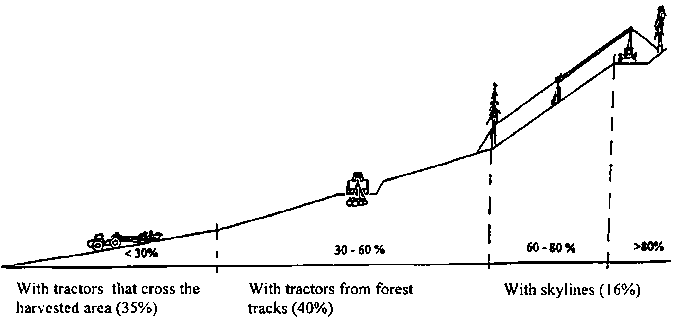 · 35 percent with a slope inferior to 30 percent; wood harvesting is performed mainly with the help of animals or with towlines or winches equipped with tractors;· 40 percent with a slope between 31 and 60 percent; wood harvesting is mainly done with tractors equipped with winches or with skylines from roads or tracks,