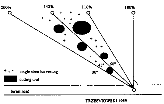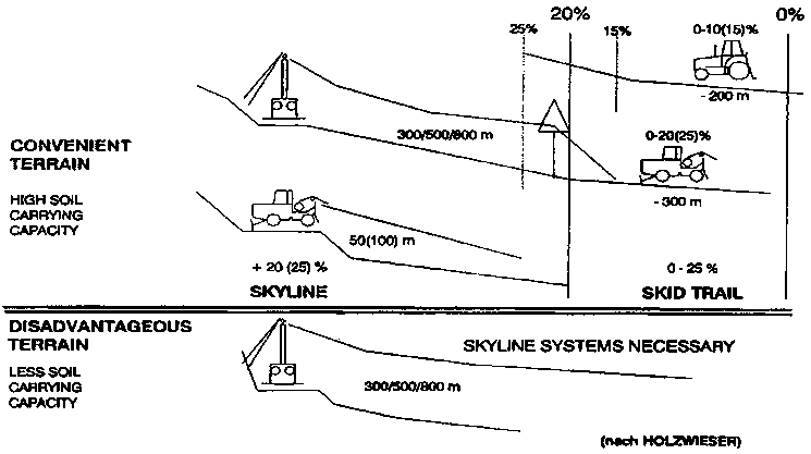 Out of ecological and economical reasons, people differentiate between skidder and cable logging terrain. In addition to the slope of the terrain, the ability to travel on the soil is a deciding factor. Further, other important factors are optimum reach of the various harvesting system possibilities, as well as consideration of the logging direction (uphill or downhill) and the total harvesting distance, are important factors.