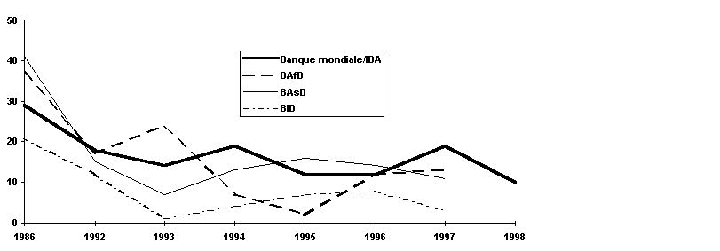 244. Les institutions multilatérales de financement ont joué un rôle essentiel dans la mobilisation d'un soutien à l'investissement pour le développement agricole et rural, mais en règle générale leurs prêts en faveur de ces secteurs ont fléchi pendant la dernière décennie. Ainsi par exemple, à partir de la deuxième moitié des années 80, les prêts de la Banque mondiale (BIRD et IDA) en faveur du développement agricole et rural, qui en 1986 constituaient près de 30 pour cent des financements totaux, sont passés à environ 12 pour cent durant les exercices 1995/96 puis à quelque 10 pour cent en 1998. Ce fléchissement général masque des différences régionales éclatantes - les prêts agricoles de la Banque mondiale en faveur de l'Afrique ont marqué un recul constant, tombant d'une moyenne de 612,8 millions de dollars E.-U. dans les années 1989-93 à 301,3 millions de dollars E.-U. en 1996, avec un creux de 176,9 millions de dollars E.-U. en 1998. On observe également une tendance générale à la baisse des prêts agricoles de la Banque mondiale en faveur de l'Amérique latine et des Caraïbes, du Proche-Orient et de l'Afrique du Nord, tandis qu'un accroissement général des prêts à l'agriculture a été enregistré en Asie du Sud et de l'Est et dans la région du Pacifique. La Banque mondiale ne constitue pas un cas à part; les prêts à l'agriculture de la Banque africaine de développement (BAfD), de la Banque asiatique de développement (BasD) et de la Banque interaméricaine de développement (BID) sont tous en régression depuis le milieu des années 80, avec quelques signes de reprise ces derniers temps.