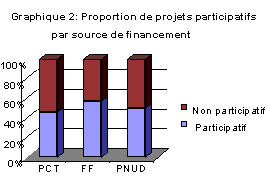 439. Du point de vue des sources de financement, les fonds fiduciaires comptaient le pourcentage le plus élevé de projets participatifs (56,7 pour cent) par rapport au PNUD (49,6 pour cent) ou aux projets PCT (46 pour cent) (voir graphique 2). Du fait que les projets PCT résultent d'une demande formulée par un gouvernement et, dans bien des cas, comportent une aide d'urgence à propos de laquelle il peut être difficile de consulter les bénéficiaires, il n'est pas surprenant qu'ils présentent un pourcentage plus faible que les autres sources de financement. Les projets de fonds fiduciaires comptaient également le pourcentage le plus élevé de projets classés dans les catégories "considérable" et "élevé".