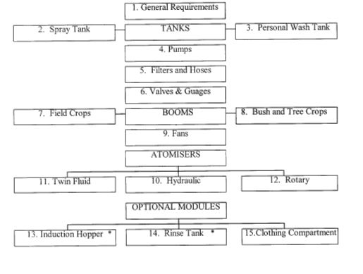 Each module relates to a major component or a functional group of components from which consistent specifications for complete spraying machines can be compiled. The various modules for vehicle mounted and trailed sprayers are shown in Figure 1.