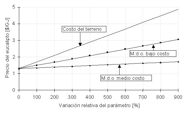 Figura 12. Análisis de la sensibilidad del costo de la leña de eucalipto durante la no-zafra en función de los potenciales en los costos de mano de obra y del valor de la tierra. "M.d.o." significa "mano de obra"