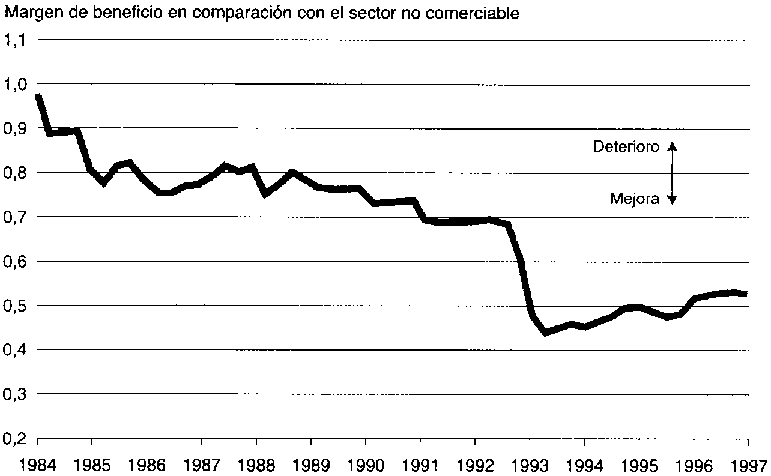 ¿Han promovido estos cambios la competitividad y la rentabilidad de las actividades forestales, como suponían muchos de los promotores del cambio? No es fácil responder a esta pregunta (véase la Figura 4). El índice del margen de beneficio sobre los precios de los insumos forestales en comparación con el sector no comerciable es un índice interno de intercambio que mide la capacidad relativa del sector forestal para atraer recursos de otros sectores de la economía neozelandesa. Gráficamente, una curva ascendente representa un deterioro en la competitividad, ya que el margen de beneficio sobre los precios de los insumos forestales se ha reducido en comparación con el sector de bienes no comerciables, lo que es un aliciente para que los recursos salgan de aquel sector para venir a éste. Inversamente, una curva descendente representa una mejora, pues el sector forestal se ha hecho más rentable en comparación con el de bienes no comerciables. La figura indica que el sector forestal ha mejorado claramente su posición competitiva desde los últimos años ochenta, coincidiendo con el período de constitución de empresas y privatización. Sin embargo, atribuir esto enteramente a ambos procesos sería equívoco. Un factor clave que se trasluce en la curva es el máximo alcanzado por los precios de la madera en 1993. De todas maneras, la teoría económica que dice que las conclusiones son más contestables cuanto mayor sea el número de actores en la industria, sugiere que una parte de este movimiento puede atribuirse a la privatización.