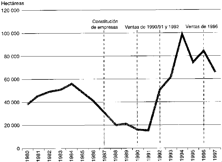 En la época de las ventas de 1992 y 1996 el ambiente político había evolucionado. Una condición de estas últimas ventas fue que se reno varan las plantaciones amenos que el propietario del bosque se propusiera dedicar la tierra a otro uso sostenible con la aprobación del Gobierno. La introducción de esta disposición no se debió a que los niveles de plantaciones hubieran descendido, pues no fue así (Figura 5). Se trataba más bien de dar seguridades a los partidarios de la reforestación. Cabía sostener que tales seguridades eran innecesarias, pues los cambios del sistema impositivo, las subidas de precios de los productos forestales y la publicidad estaban estimulando las plantaciones en los años noventa y llevando la forestación a muy altos niveles históricos.