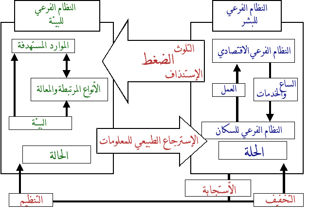 ويمارس النظام الفرعي للبشر ضغوطا معقدة على النظام الفرعي للبيئة من خلال مثلا، التلوث والاستنزاف، ويحصل على تنبيهات مرتدة منه. ويمكن تقسيم هذيه النظامين الفرعيين نفسهما الى عناصر أصغر واظهار العلاقة بينها. فعلى سبيل المثال تتبادل العناصر الرئيسية والسكانية في النظام الفرعي البشري السلع والخدمات وقوى العمل.