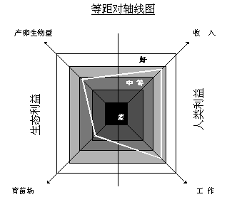 采用了各种形象化方法,表明不同程度的复杂性。Prescott-Allen (1996年)鉴于生态系统利益和人类利益这一简单的两个方面框架作为一个简单"可持续性标准"。使用一个有若干轴的对折线图可以进行更多方面的说明,更多方面的说明表明了不同系统"标记",包括从所有参数得出想要数值的"理想的"一个系统的"标记"(Garcia, 1997年)。