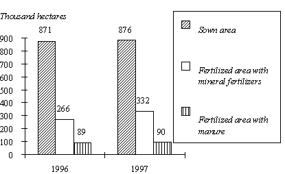 During the last 20 years, 50-55 percent of the total harvest of crop production was received on account of inorganic fertilizers used. In 1988, the area fertilized with mineral fertilizers was 92 percent of the sown acreage, while in 1996, the coverage was only 31 percent. Manure was used on 10 percent of the sown area.