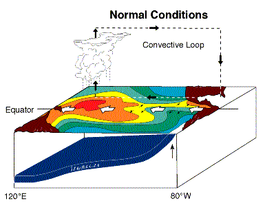 What is the El Niño Southern Oscillation?The El Niño Southern Oscillation is the result of a cyclic warming and cooling of the surface ocean of the central and eastern Pacific. This region of the ocean is normally colder than its equatorial location would suggest, mainly owing to the influence of the northeasterly trade winds, a cold ocean current flowing up the coast of Chile and the upwelling of cold deep water off the coast of Peru. At times, the influence of these cold water sources wanes, causing the surface of the eastern and central Pacific to warm up under the tropical sun - this is an EL NIÑO event. This results in heavy rainfall in South America, but severe droughts in eastern Australia. The more intense the El Niño, the more intense and extensive the Australian droughts. At other times, the injection of cold water becomes more intense than usual, causing the surface of the eastern Pacific to cool - this is a LA NIÑA event. This results in droughts in South America and heavy rainfall, even floods, in eastern Australia. In this way, Australia experiences its characteristic cycle of droughts and floods - all caused by the El Niño/La Niña cycle described above.