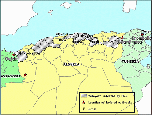 FMD is a notifiable disease in all North African countries. An epidemic of FMD was first declared in February 1999 in Algeria. The disease appeared simultaneously in the wilaya of Souk Ahras (20 km from the Tunisian border) and in Algiers. Up to June 1999, the number of declared outbreaks in the country was 165.
