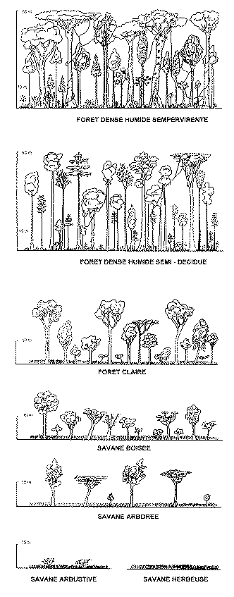 Les forêts denses humides Les forêts denses sempervirentes se situent dans des zones où la pluviométrie annuelle est supérieure à 2,000 mm avec moins de trois mois secs par an. Elles sont caractérisées par une structure complexe, une grande richesse floristique et animale et une prédominance d'essences à bois dur pouvant atteindre 40-50 mètres de hauteur. La canopée reste feuillée toute l'année, chaque arbre ayant un rythme propre de défoliation. Les forêts denses humides semi-décidues correspondent à une pluviométrie annuelle comprise entre 1,000 et 2,000 mm/an avec moins de six mois secs. Leur structure et leur composition floristique varient beaucoup en fonction de la pluviosité et des sols. Moins riches en espèces animales et végétales que les forêts sempervirentes, elles sont caractérisées par une chute partielle des feuilles en saison sèche. On y note une grande richesse en essences commerciales de valeur à bois tendre (hauteur 40-45 mètres). Les forêts de montagne poussent à des altitudes supérieures à 1,000 m. Selon le climat, ce sont en général des faciès des forêts denses humides. Les arbres et arbustes sont moins élevés que dans les formations de plaine. Elles sont riches en mousses et lichens épiphytes et espèces ombrophiles. Les forêts sèches Les forêts sèches apparaissent avec une pluviométrie annuelle comprise entre 600 et 1,200 mm/an avec moins de 8 mois secs/an. Leur structure est bistrate, avec une strate arborée décidue (hauteur 15-20 mètres) sous laquelle se développe une strate arbustive et graminéenne. Leur protection contre les feux de brousse est essentielle pour assurer leur viabilité. La disparition des ligneux s'accompagne du développement de la strate herbacée. Il existe des formations sèches de montagne. Les forêts claires se rencontrent dans les régions où la pluviométrie annuelle est comprise entre 300 et 600 mm/an. Ce sont des formations mixtes, ligneuses et herbacées, dont le couvert ligneux est inférieur à 50%. Dégradées, elles cèdent la place aux savanes arborées ou boisées où le couvert arboré dépasse rarement 15%. Les mangroves Ce sont des formations sempervirentes côtières poussant en dessous du niveau de la mer. Les espèces végétales, peu nombreuses, doivent supporter l'immersion temporaire en milieu halophile. Cet écosystème particulier offre un potentiel important de production diversifiée (bois, tanin, animaux marins...). Il est fragile, au même titre que les forêts marécageuses, ripicoles ou périodiquement inondées. Ces forêts sont étroitement liées à la dynamique hydrique du milieu qui les caractérise. |