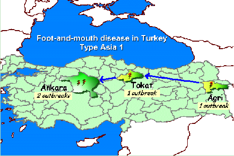 FMD type Asia 1 outbreaks were reported in Iran in September. This is the first report of Asia 1 in Iran since 1991. Asia 1 has also been reported in Turkey: first in Agri Province close to Iran in November and two outbreaks in Ankara Province in December.
