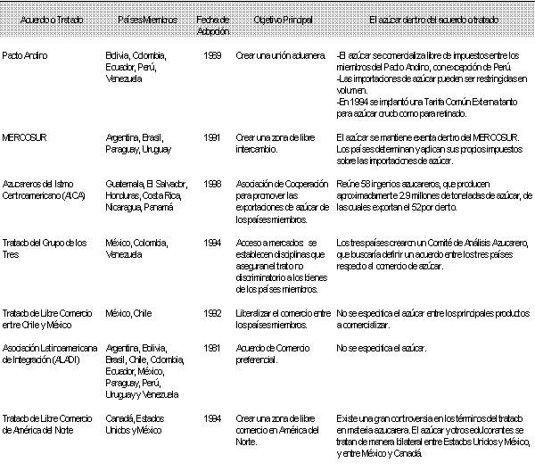 Como se puede apreciar en los Acuerdos y Tratados de Libre Comercio, vigentes en América Latina, el comercio del azúcar es un asunto bastante delicado, de hecho en la mayoría de los acuerdos se excluyó este producto, con excepción del Pacto Andino, en donde el azúcar se comercializa libre de impuestos entre Bolivia, Colombia, Ecuador y Venezuela, excluyendo a Perú que forma parte del grupo, al cual le dieron un tiempo (10 años) para integrarse al libre comercio en materia azucarera.