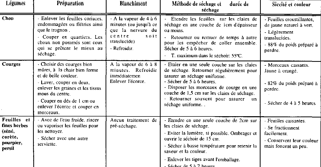 TABLEAU I GUIDE SUCCINT POUR LA PREPARATION ET LE SECHAGE DES LEGUMES ET DES FEUILLES VERTES Partie 3