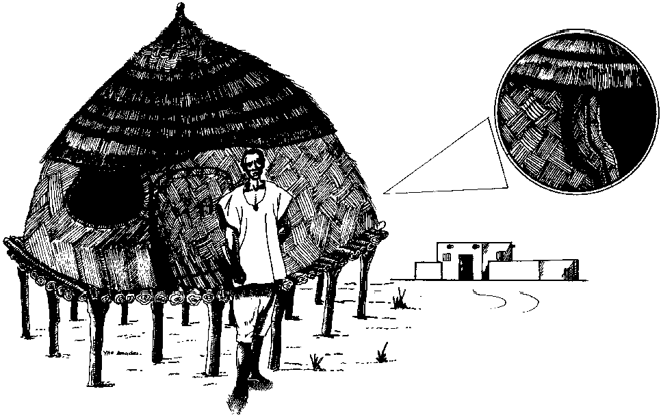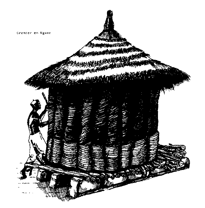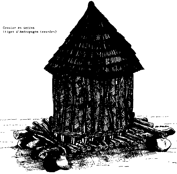 Figure 1: Grenier traditionnel pour le stockage de céréales en épis (Sénégal). Fait en tiges de Guiera senegalensis tressées. A remarquer poutres maîtresses et poteaux remplacés par trois supports en briques de ciment.