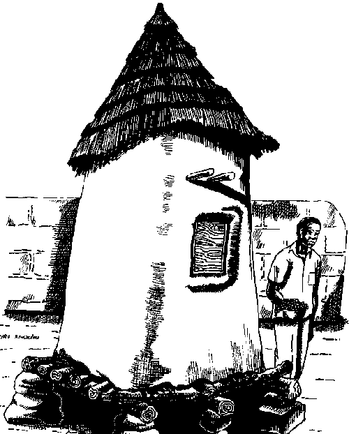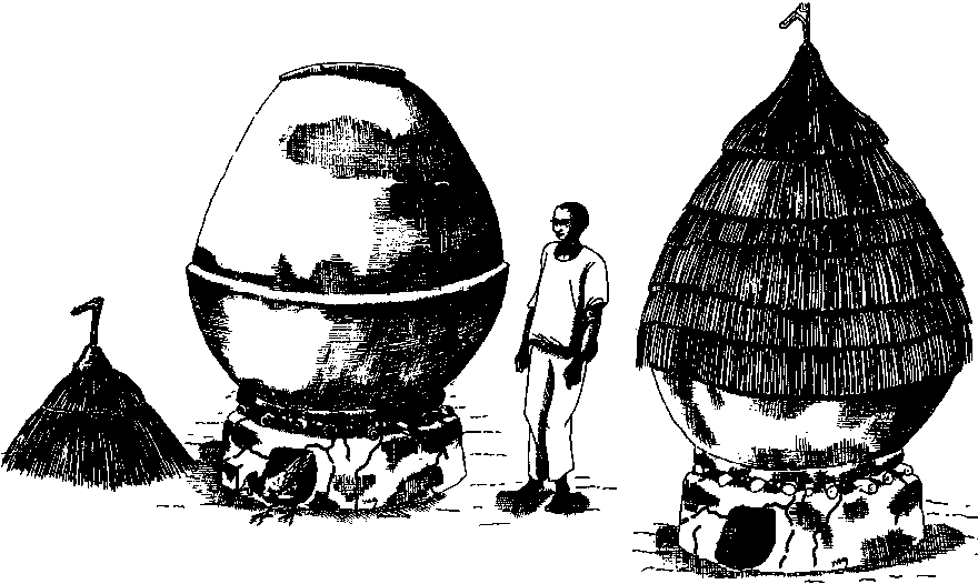 Cependant, suite aux effets de la sécheresse, les espèces d'arbres citées plus haut, les tiges d'Andropogon et la paille utilisée pour la toiture sont de plus en plus difficiles à trouver. De plus, une nouvelle réglementation sur la coupe des arbres adoptée par le Burkina Faso en 1985, limité sérieusement l'emploi des pièces de bois habituelles. Cet ensemble de contraintes explique aisément l'apparition d'une évolution des techniques qui consiste à crépir d'argile les parois intérieure et extérieure des greniers en paille (cf. figure B.3).